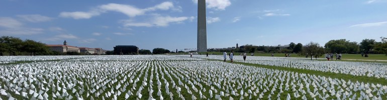 TOPSHOT – White flags are seen on the National Mall near the Washington Monument in Washington, DC on September 19, 2021. – The project, by artist Suzanne Brennan Firstenberg, uses over 600,000 miniature white flags to symbolize the lives lost to Covid-19 in the US. (Photo by Daniel SLIM / AFP) (Photo by DANIEL SLIM/AFP via Getty Images)